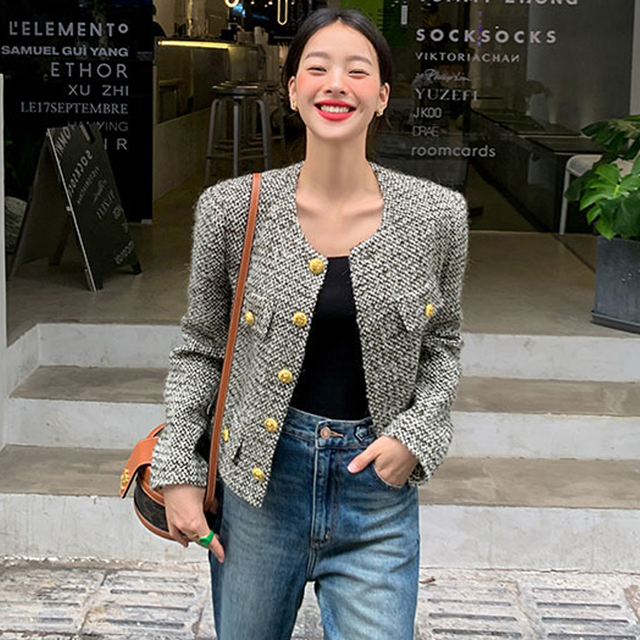 자, 오늘의 주인공은 23년 공방 시즌으로 준비가 되어 있는 미친 트위드 자켓이고 특이한 점은 페이크 진주 혹은 모조 진주라는 아주 작은 펄 포인트와 트위드의 만남으로 준비된 아이입니다. 그리고 골드버튼으로 블랙 안에 끼친 포인트를 강조해주네요.ㅎㅎ